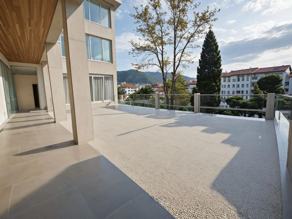 Terrasse, balcons et jardin donnant sur une école.